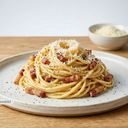 Serveras med bacon, svartpeppar, grädde och nyriven parmesanost. Innehåller ägg