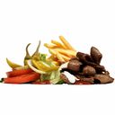 Kött med sallad, chilidressing, tomat, jalapeños, lök, ost och pommes frites. Välj storlek samt dryck i nästa steg.
