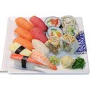 3 lax, 1 tonfisk, 1 vitfisk, 1 räka, 1 avokado, 1 krabbfisk, 1 omelett, 6 rullar.