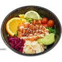Grillad kycklingfilé, körsbärstomater, gurka, picklad rödlök, inlagd ingefära, sjögrässallad, edamamebönor, rostad lök, sesamfrön, vårlök och mango. Välj sås i nästa steg.