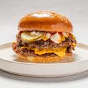 2 x 65 g tunnpressat nötkött (well done) med 3 skivor cheddarost, inlagd jalapeño, vit lök och majo.