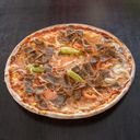 Tomatsås, ost, lök, färska tomater, feferoni, kebabkött (nötkött), kebabsås stark och vitlökssås.