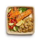 Med quinoa, soltorkade tomater, gurka, rödkål, sojabönor, inlagd ingefära, keso, rostade sesamfrön & grillad lax. Ange dressing i önskemål: Curry, fetaost, vitlök, basilika, franskvinägrett, om inget önskemål görs skickar restaurangen passande dressing.