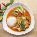 (lite stark) Röd curry gryta, kyckling, bambuskott, kokosmjölk, paprika, limeblad, haricots, zucchini och basilika. (lite stark)