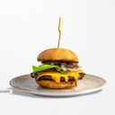 Dubbelt kött med cheddarost, pepperjack-ost, bacon, hickory sauce och lök.