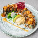 Med halstrad lax, friterad räka, gurka, babyspenat, avokado och Philadelphia ost.