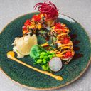 Friterade räkor och grönsaker, gräslök, rostadlök, gurka, chilimajonnäs, avokado och teriyakisås
