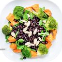 Grillad halloumi, ugnsrostad aubergine, avokadocrème, blandsallad, gurka och tomat.