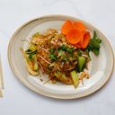 Nudelsallad med wokad kycklingimiterad tofu och citrongräs. Serveras med kokta risnudlar, sallad och hoisinsås. Toppas med jordnötter och rostad lök.