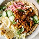 Kycklingfilé, grillade grönsaker, tabbouleh och valfri röra. Välj röra i nästa steg.
