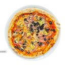 Tomatsås, ost, skinka, räkor, kronärtskocka, musslor och färska champinjoner.