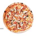 Tomatsås, ost, färska champinjoner, bacon, salami och lök.