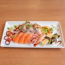 11 bitar. 3 lax, 1 räka, 1 tonfisk, 1 avokado, 1 ägg och 4 rullar.