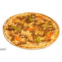 Pizza med kebabkött, ananas, färska champinjoner, lök och sås.