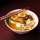 Kycklinglårfilé, misobuljong, kokos-tare, vetenudlar, koriander, jordnötter, salladslök, ägg, chiliolja Chicken thigh fillet, miso broth, coconut tare, wheat noodles, coriander, peanuts, spring onion, egg, chili oil