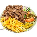 Tomatsås, Ost, Kebabkött (nötkött), Lök, Tomater (färska), Feferoni, Isbergssallad, Pommes frites, Välj sås i nästa steg