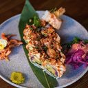 Tempurafriterad scampi, gurka, avokado, gräslök, inlagd rödlök toppad med halstrad lax, umamimajo, teriyakisås, rotfruktschips, togarashi, sesam. Serveras med chuka ika, wakame, gari & inlagd rödlök