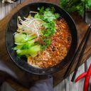 🌶 Stewed minced beef with bean sauce, sesame peanuts sauce, bean sprouts, pak choi, spring onion, coriander