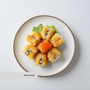 Friterad rulle med lax, tonfisk, räka, krabbfisk, gurka, avokado & färskost. Toppas med rostad lök och sesamfrön. Chilimayo, teriyakisås, srirachasås på sidan