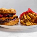 2 x cheddarost, bacon, picklad röd lök, chipotlemajonnäs, blåbär och habanero BBQ sås.