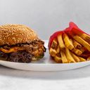 Svenskt nötkött, 2x cheddar, senapsstekt, majonnäs, dillpicklad gurka, friterad lök, gul lök.