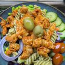 Pasta . Sallad. Gurka. Tomat. Paprika. Salladsost. Oliver. Rödlök. sojabönor