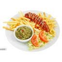 Två grillade korv, sallad, lök, tomat, senap, ketchup, bostongurka. Välj mellan strips eller mos.