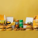 4 valfria burgare, 4 st tender bites, 6 st wings, 8 st popcorn, 4 st valfria Sidez, fyra läsk och fyra valfria såser.