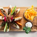 Välj proteinval, kött, kyckling eller mix. Samt välj ett tillbehör till, Ris, bulgur, pommes eller sallad.