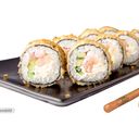 10 Bitar Friterad Maki Med Jätte Räkor, Gurka Och Röstad Lök Toppad Med Chillimajonäs Och Teriyaki Sås
