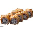 10 bitar Friterad Maki Med Lax, Gurka Och Röstad Lök Toppad Med Chillimajonäs Och Teriyaki Sås