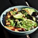 Serveras med marinerad tofu, avokado, myntadressing, gurka, rostad sötpotatis, jordnötsdressing, cashewnötter, vårlök och koriander.
