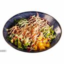 En skål med lax, ris, grönsaker och smakfull sås. Fräsch och mättande måltid.