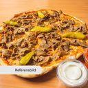 Tomatsås, ost, kebabkött (nötkött), feferoni, lök och valfri sås.