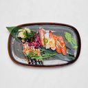 Lax, friterad krabba, grönsaker, avokado, toppad med philadelphia ost, ikura, gräslök och teriyaki sås