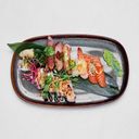 2 lax, 1 grillad lax, 1 räka, 1 vit fisk och 3 rullar.