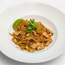 Tofu i söt och syrlig sås, serverad med ris och nudlar.