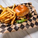 Burgare med husets dressing, krispsallad,karamelliserad lök, tomat cheddarost, bacon och BBQ sås
